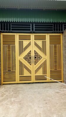 Cửa cổng sắt 4 cánh màu vân gỗ đẹp